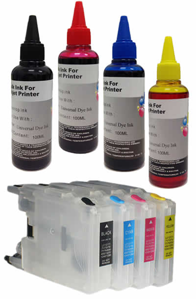 Kit 4 Cartucce Vuote Compatibili Brother Serie LC-1280 e 4 Inchiostri da 100 ml.