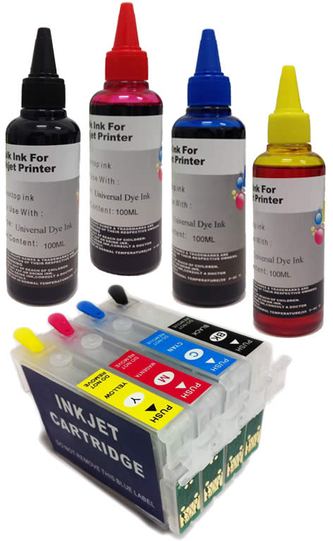 Contenuto: 01 Cartuccia Vuota Ricaricabile T2991 da 16 ML, 01 Cartuccia Vuota Ricaricabile T2992 da 11 ML, 01 Cartuccia Vuota Ricaricabile T2993 da 11 ML, 01 Cartuccia Vuota Ricaricabile T2994 da 11 ML, con chip aggiornato V2, + 4 Bottiglie di Inchiostro da 100 ml. (Nero – Ciano – Giallo – Magenta), guanti e siringhe.